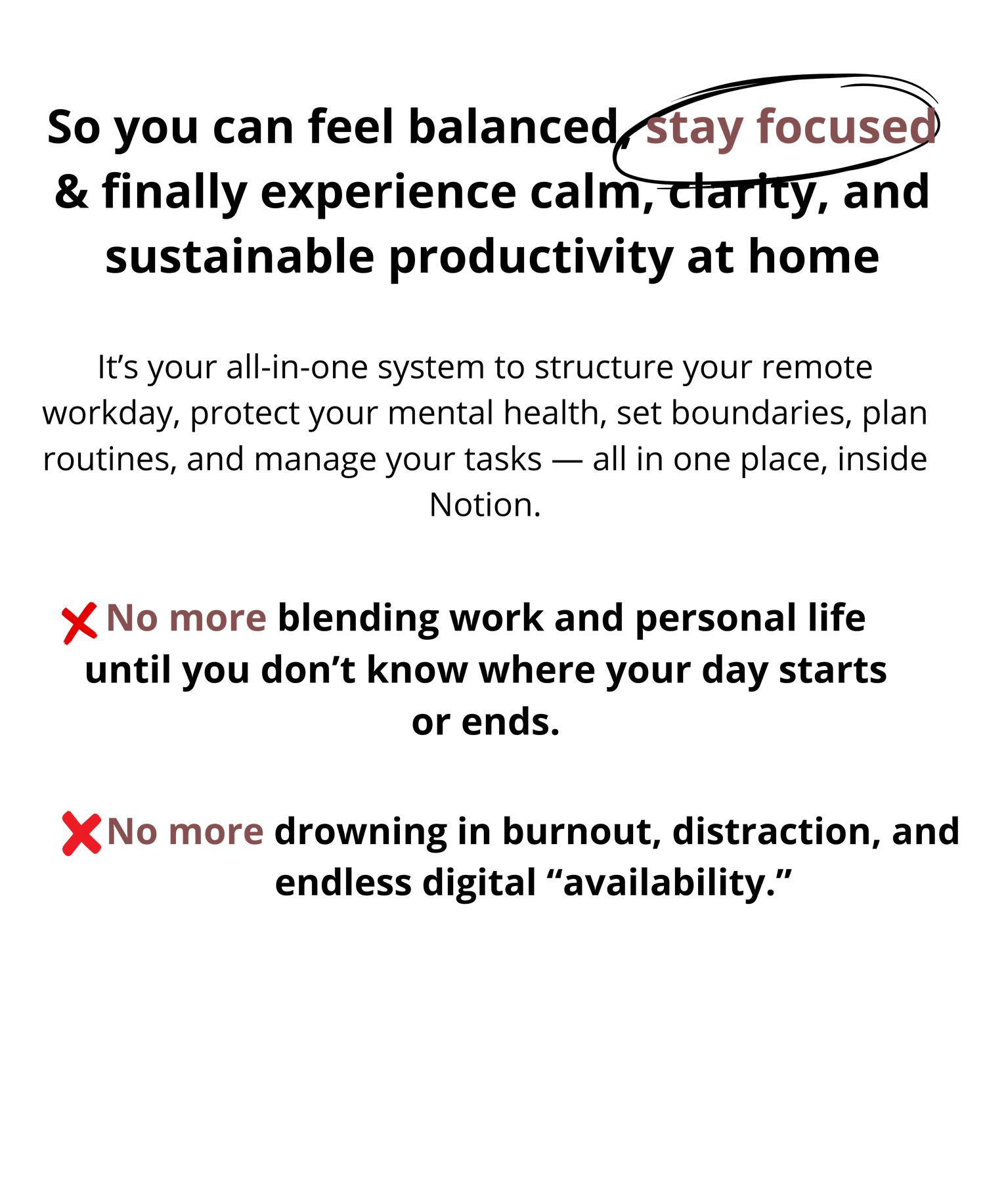 With RemoteCalm, you’ll have one streamlined Notion system for your tasks, routines, goals, boundaries, and daily structure —