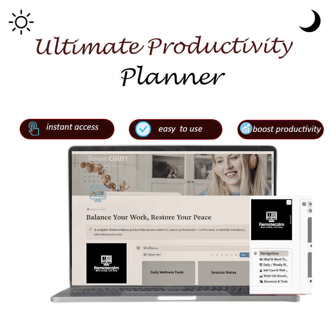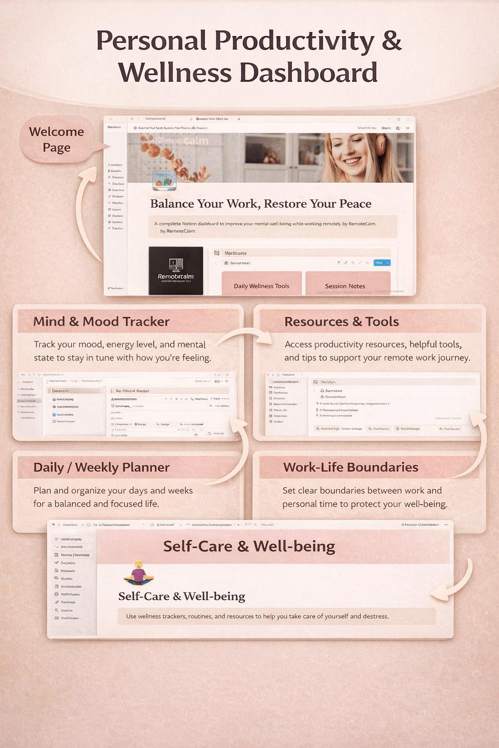 RemoteCalm is built inside Notion — giving you a calm, structured, and beautifully organized workspace designed to support your mind, not overwhelm it.